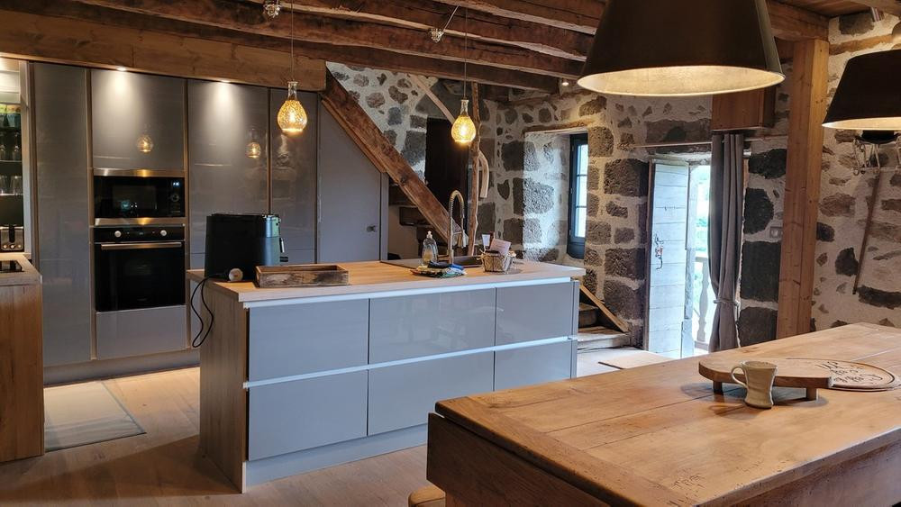 - first floor: 1 private suite with 160cm bed and semi-open bathroom, wc, office area (ethernet point, wifi, reading corner) overlooking the valley; a large living room with ultra-modern, fully-equipped kitchen (plus: duo espresso machine, connected food processor...), . reading corner near the pellet stove. Access at the rear of the house to a 40m² garden with garden furniture and dining area.