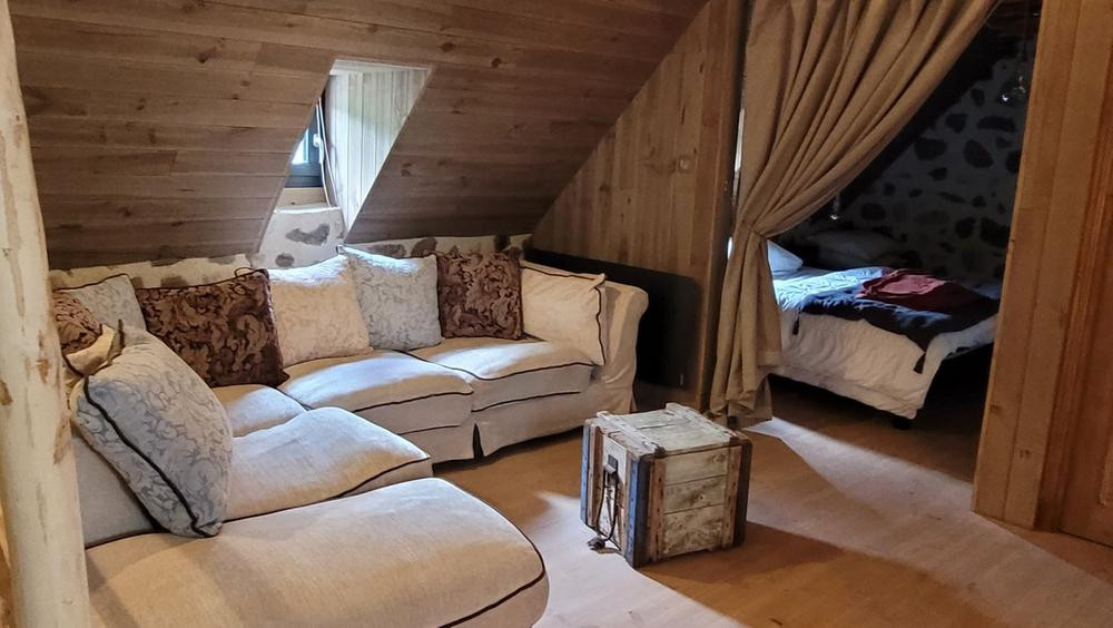 - Upstairs: a large bedroom with 2 separate beds, a large living room with connected TV, a bathroom with shower and island bath, wc, a small semi-open cocooning bedroom with 140cm bed.
