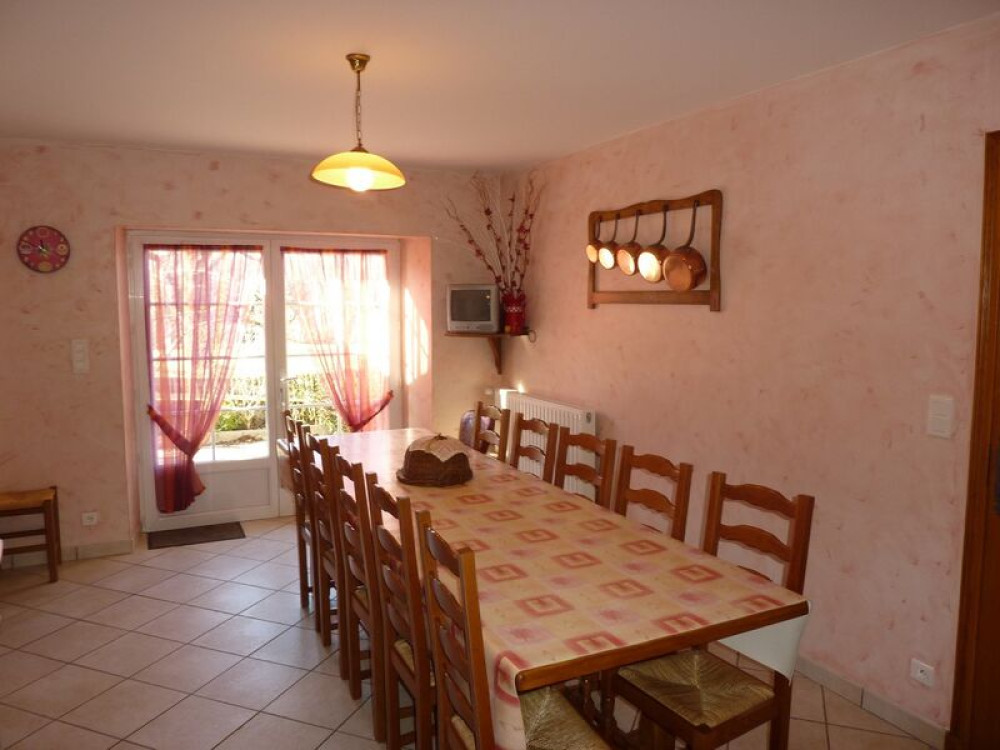 With a surface area of 120 m² (4 bedrooms for a total capacity of 10 people), the house is attached to another gîte. Living room, dining room, kitchenette. 4 bedrooms (4 x 2-person beds and 2 x 1-person beds) + 2 benches (80 cm bed) and a sofa bed. 2 cots. Shower room, bathroom and separate WC. Oil-fired heating. Video library, DVD player. Internet access, wifi.