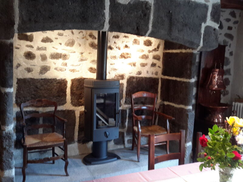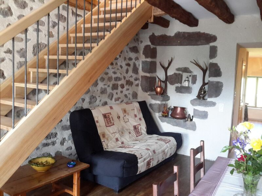 Dans joli village verdoyant et calme, entre Aurillac et le Lioran, proche de toutes commodités (1 km commerces, piscine, parc, mini-golf, gare), gite entièrement rénové.Location composée d'une grand pièce à vivre avec cheminée (bois fourni), convertible 2 pers., cuisine entièrement équipée avec coin repas et bar, 1 wc, à l'étage, salle d'eau, wc indépendant, 1 chambre avec 1L, 1 ch. avec 2 lits.