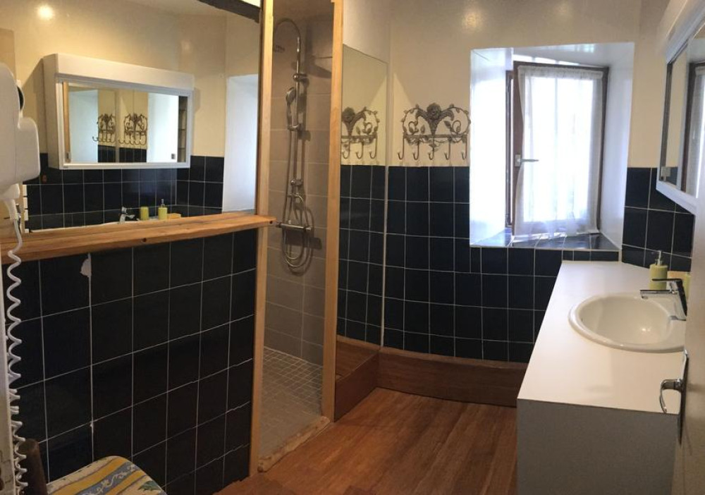 - 1 salle de bains avec douche à l’italienne, lavabo et sous-meuble, sèche-cheveux fixe, sèche-serviettes